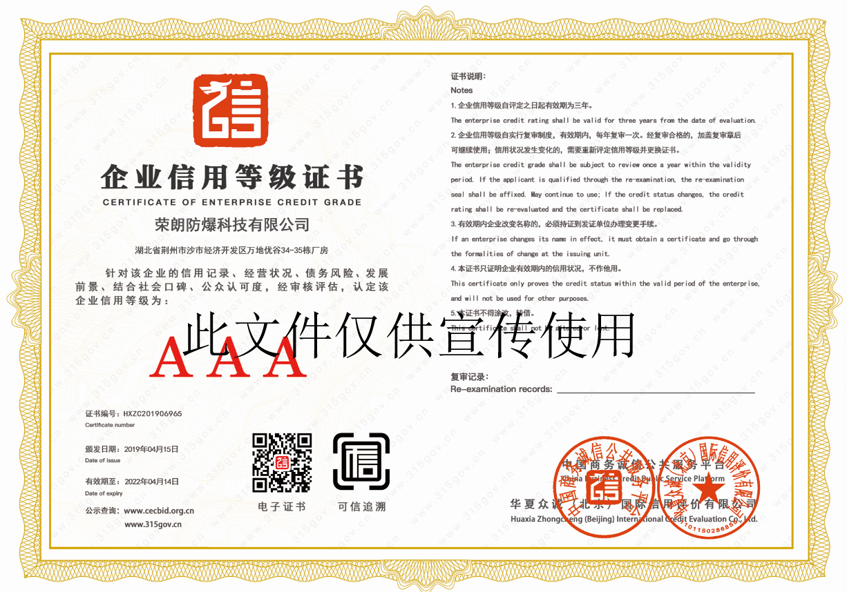 企業信用等級證書 發布時間:2020-04-30T08:14:14 內容來源:LED防爆燈 企業信用等級證書企業信用等級證書-www.www.suyibang.com.cn 誠信經營示范單位資質證書 RLBX97-LED防爆投光燈防爆證書
